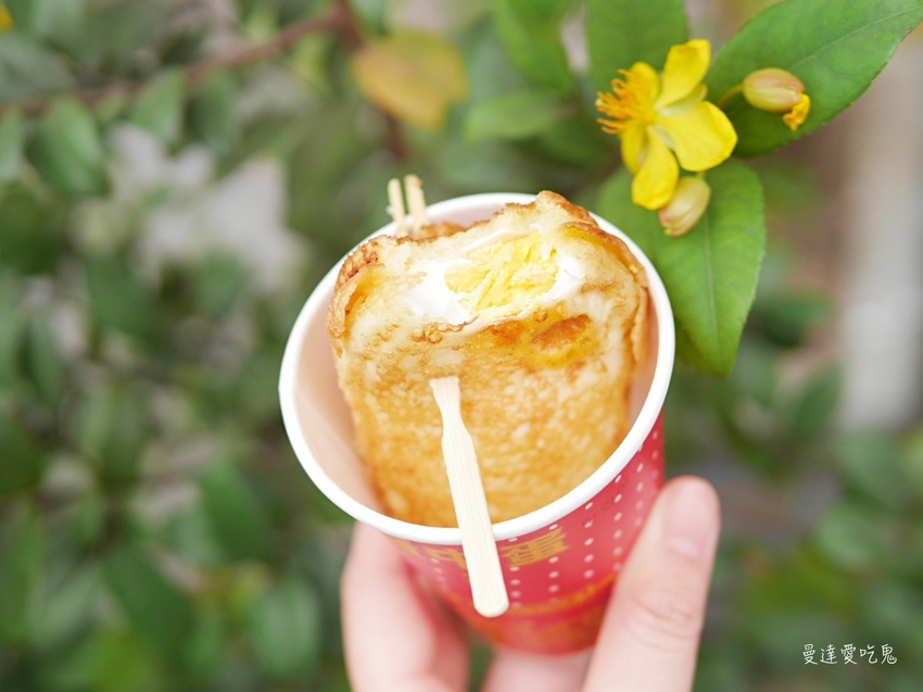 旗山老街 散步甜點推薦~ 雞蛋糕台灣、韓國大不同,位於旗山火車站前的 梨大蛋中蛋 香香雞蛋糕裏包裹著完整雞蛋,趁熱大口咬,牽絲起司迷人到不行啦!