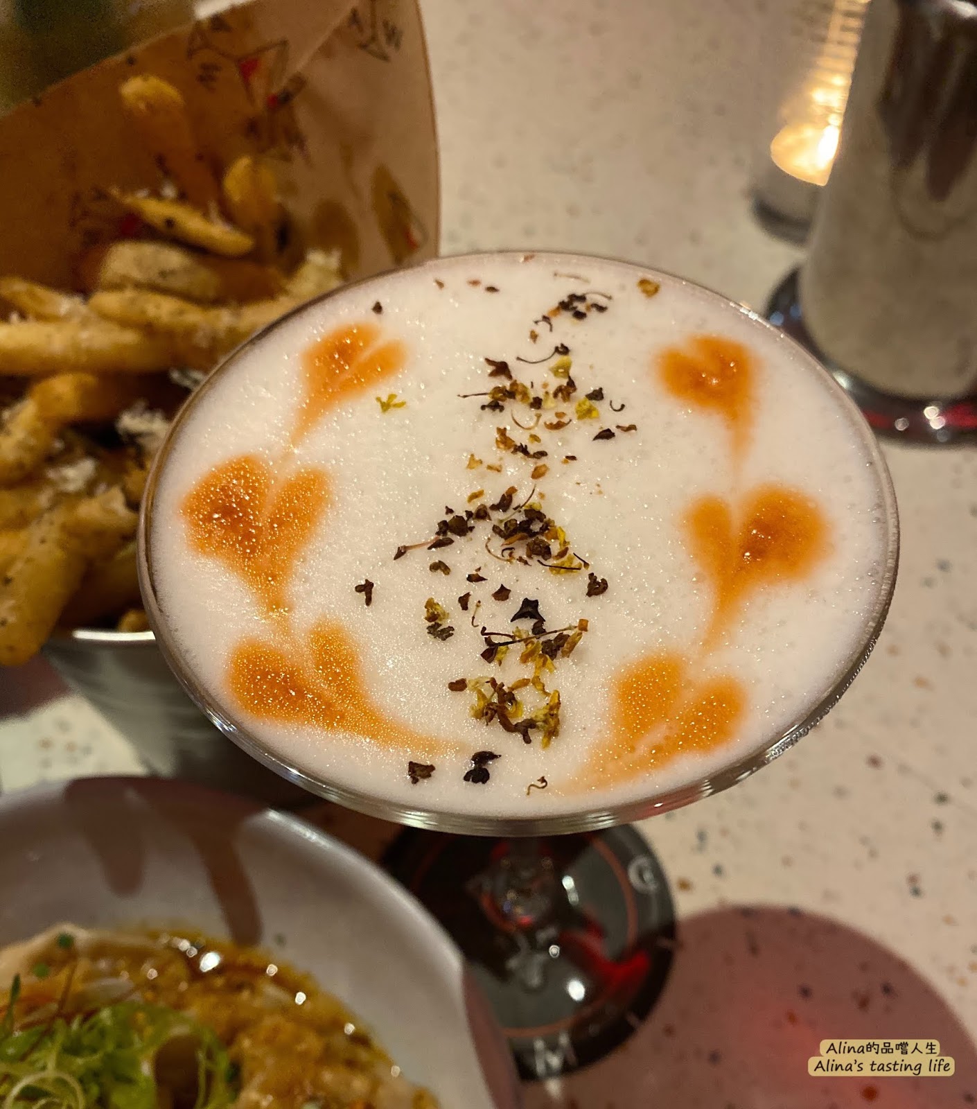 這是杯深得少女心得調酒,上面撒上的桂花香氣十足,白色的泡沫是打發的蛋白,另外上面還畫出了愛心,整杯充滿著甜蜜的滋味!