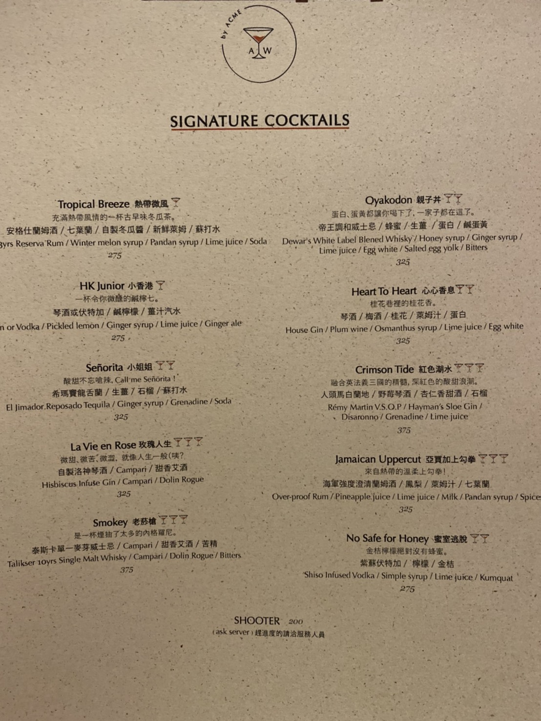 這次我們的調酒都是點相對保守安全牌的,因為這家的酒單實在是太酷了,尤其是名稱和介紹讓人會心一笑,例如親子丼、亞買加上勾拳等,都讓人看了好有畫面聯想。