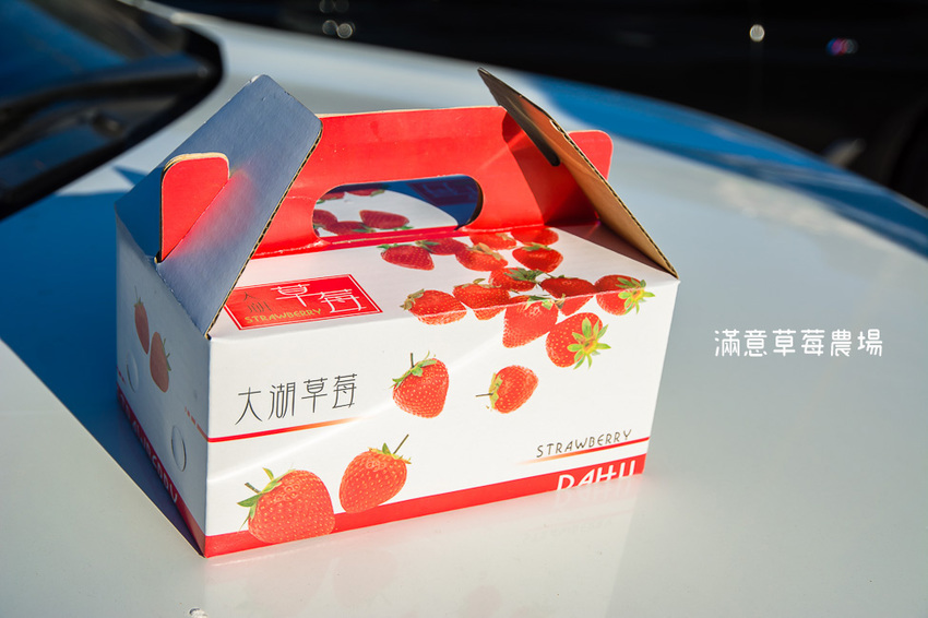 採好的草莓連同籃子一起拿去給老闆,會幫你秤重裝盒子,這個草莓盒子超可愛的,很適合拿來當禮盒送禮,一拿上車小朋友們就迫不急待的想要吃草莓了,