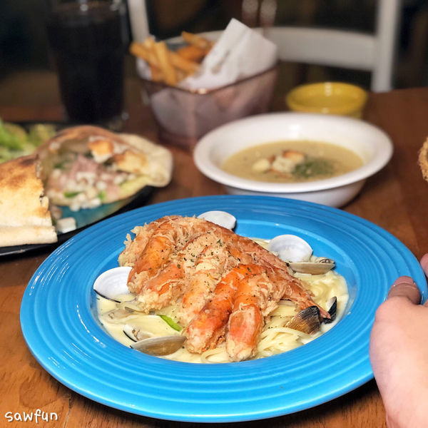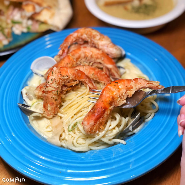 主餐我一個選很特別的烤餅跟有滿滿大蝦的Pasta🦐