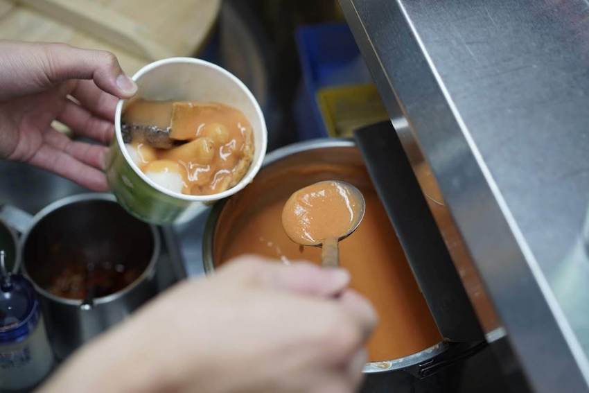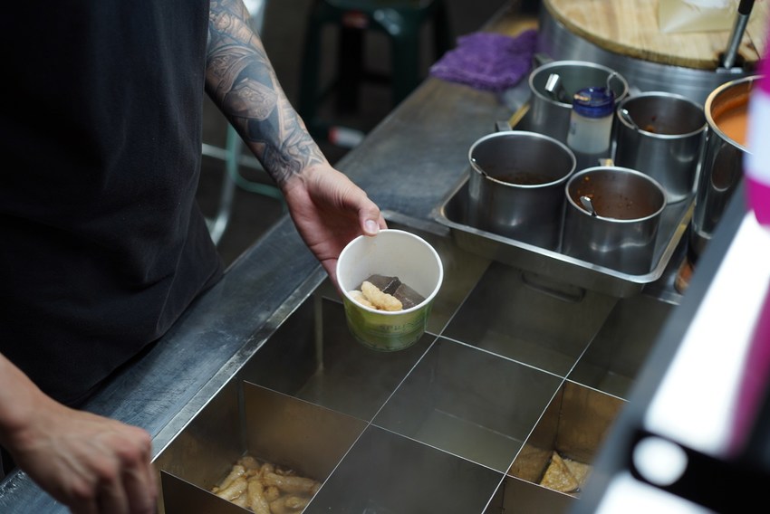一碗有六種配料,有台北甜不辣片、台北甜不辣條、鱈魚丸、豬血糕、手工油豆腐、韓國年糕,配料上都是我喜歡的,只不過少了我愛的白蘿蔔,配料上都帶點Q勁,最重要的靈魂肯定是店家自製的甜不辣醬,是以北部人的口味去調整的,越吃越愛!最後吃完一定要加湯,湯頭是以蘋果、洋蔥熬煮出的,冷天必來一碗暖暖身子,清甜的湯頭越喝越順口!