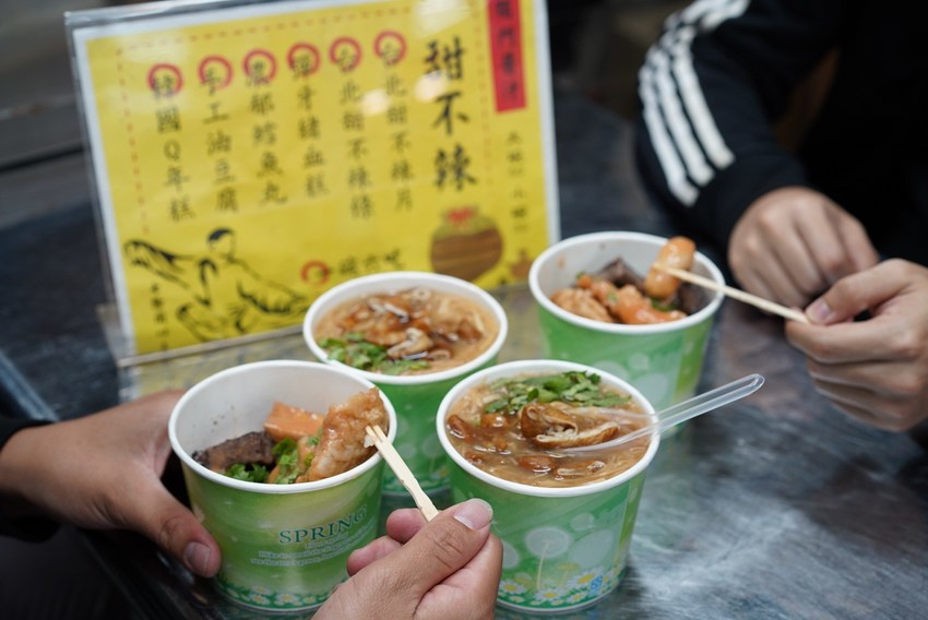 當天與兩位兄弟一起來逛忠孝夜市,三個人點了各兩碗的大腸麵線跟台北甜不辣,甜不辣吃完再加個湯就可以吃飽飽了!