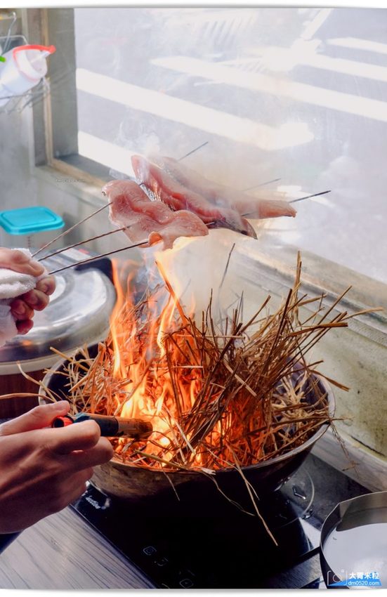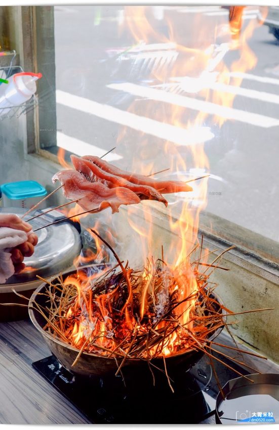 利用稻草高溫瞬間將鰹魚表層烤得酥脆,形成外熟內生口感!