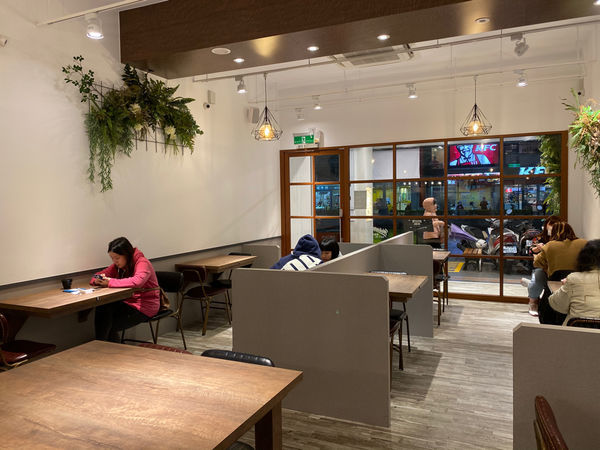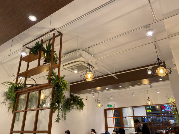 店內整體是文青風~座位挺多的!以白色系與木質桌椅來做搭配,還有帶點輕工業風的吊燈