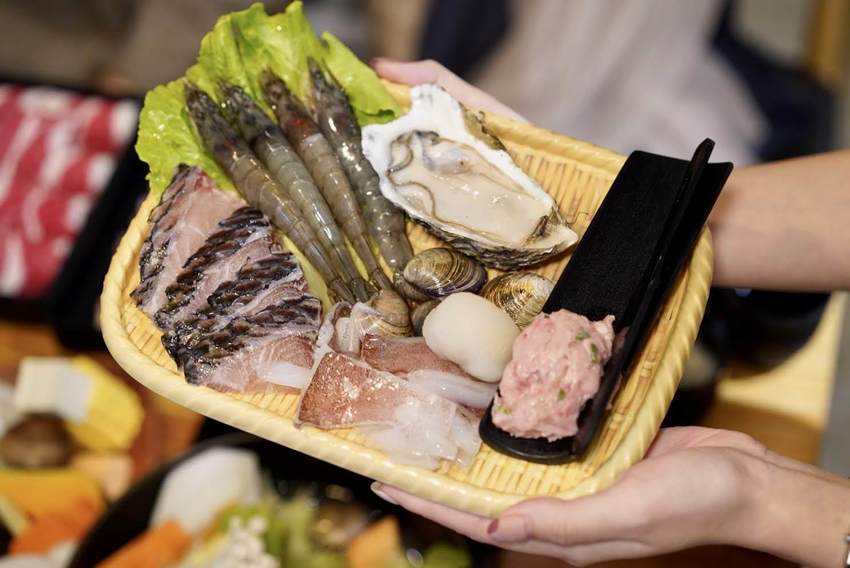 海鮮鍋的海鮮拼盤主要有天使蝦、草蝦、白蝦、鮮魚、生蠔、中卷、赤嘴、腰子貝、手工豬肉漿,而大小海陸鍋的海鮮則會比較少海鮮選擇,但會多一份肉盤。