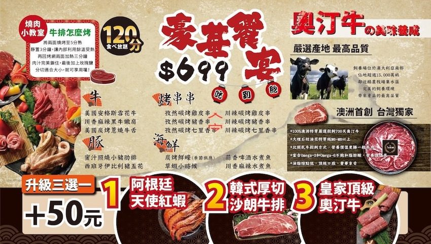 加價50元有天使紅蝦、沙朗牛排跟奧汀牛三選一吃到飽。