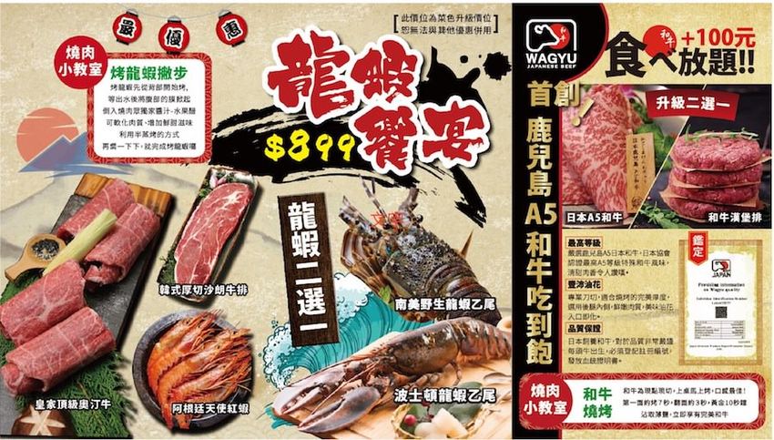 燒肉眾最頂規的組合,除了前面各價位的所有食材都能吃到飽之外,還可以每人點一隻龍蝦。