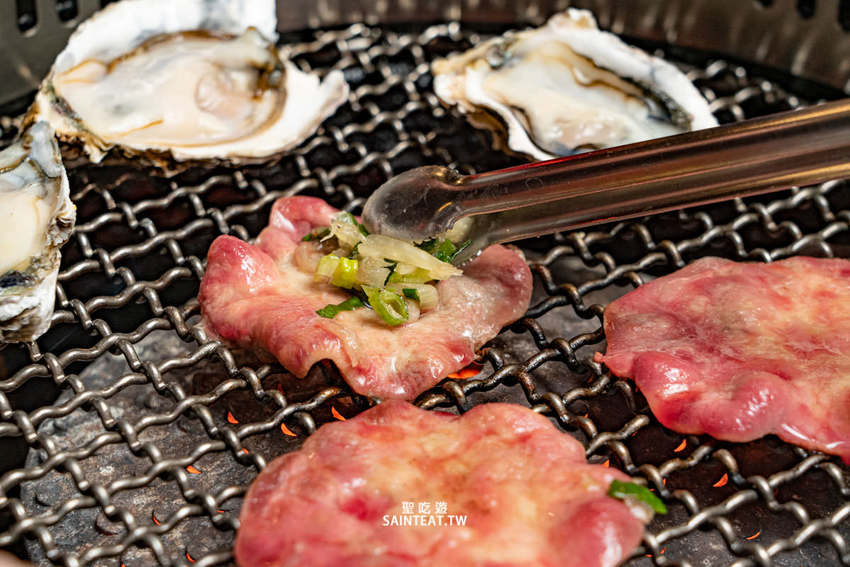 牛舌隨餐會附加鹽蔥,建議單烤一面上色之後微微出血水之後,擺上鹽蔥就可以入口直接吃囉。