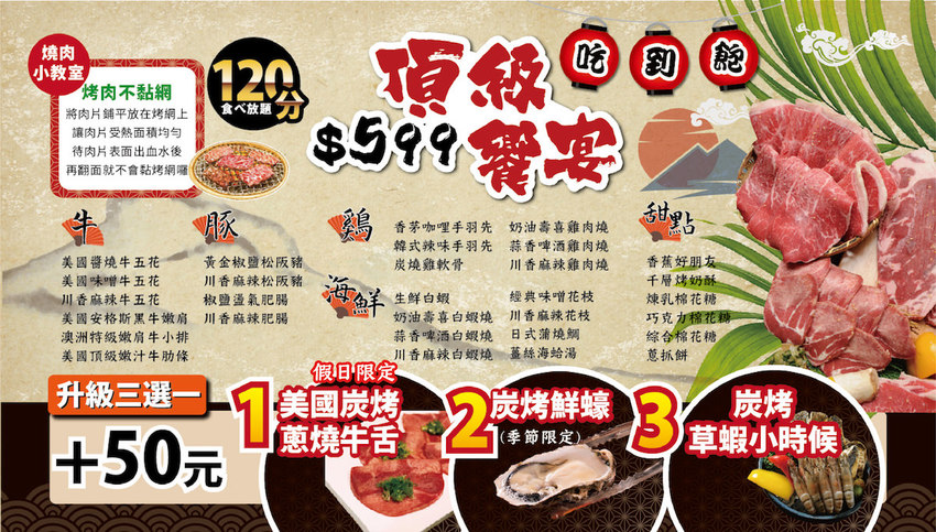 除了剛剛499的內容之外,又多了七種牛肉可以選擇。一樣可以加價50元有生蠔、牛舌(假日限定)跟草蝦吃到飽三選一。