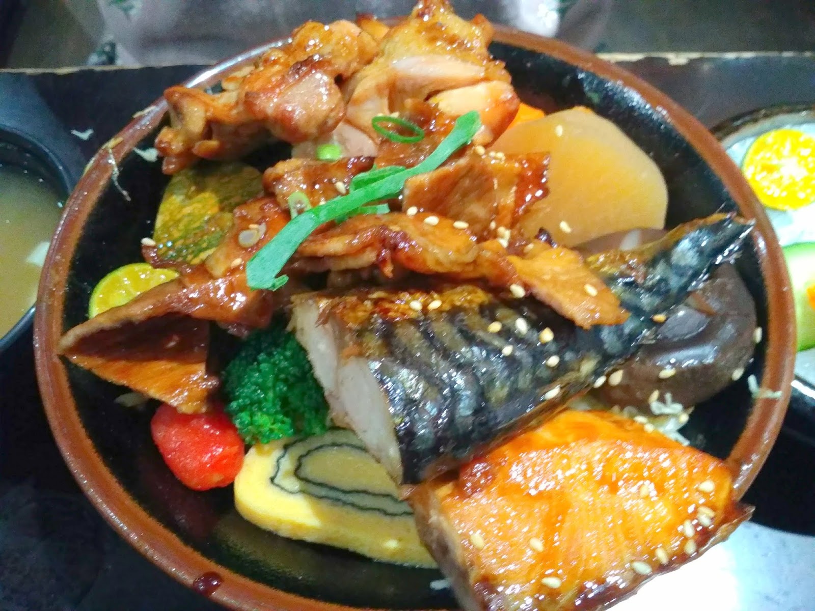 雞肉和豬肉豪邁入鏡;周圍還有附醋物、茶碗蒸、
