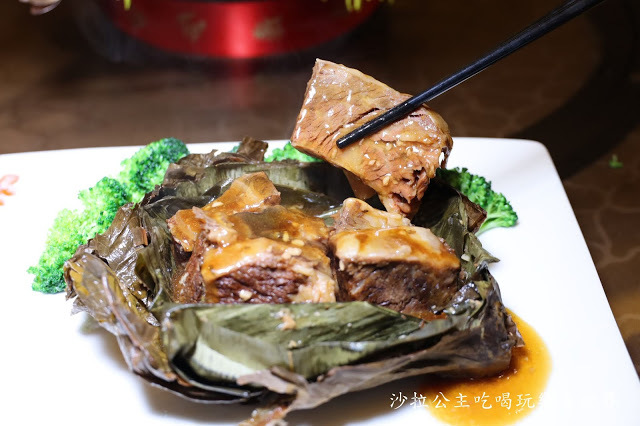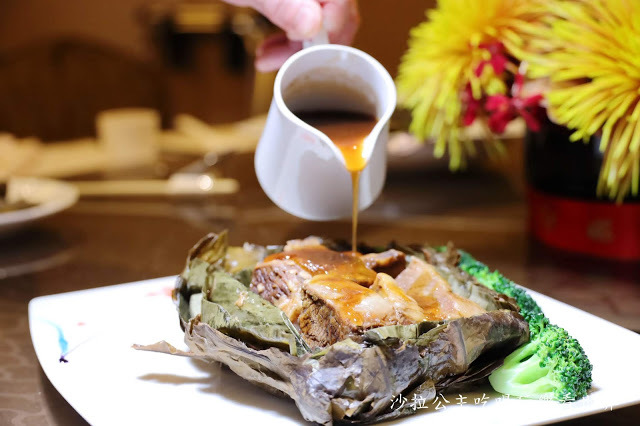 大塊的牛肉用荷葉包覆著,讓牛肉吸收荷葉淡雅的香氣,淋上特調的醬汁提升風味