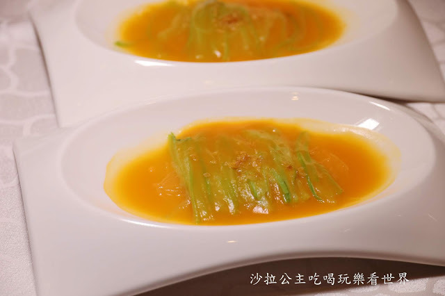 金黃的湯看起來好像南瓜濃湯,其實是使用紅蘿蔔製作的,主廚料理的蠻好的,不會有我害怕紅蘿蔔的腥味,不然我超怕紅蘿蔔的,"菌菇黃燜絲瓜"吃起來很清爽,絲瓜也很脆口,想吃清淡點的料裡"菌菇黃燜絲瓜"是不錯的選擇喔
