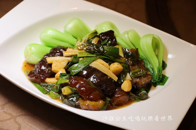 已富有交直的海參為主角,佐以炸過的三星蔥語青江菜一同燴燒,Q中帶點脆度的海參好吃又養顏美容