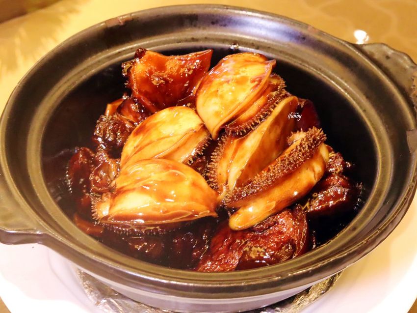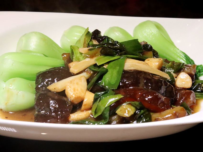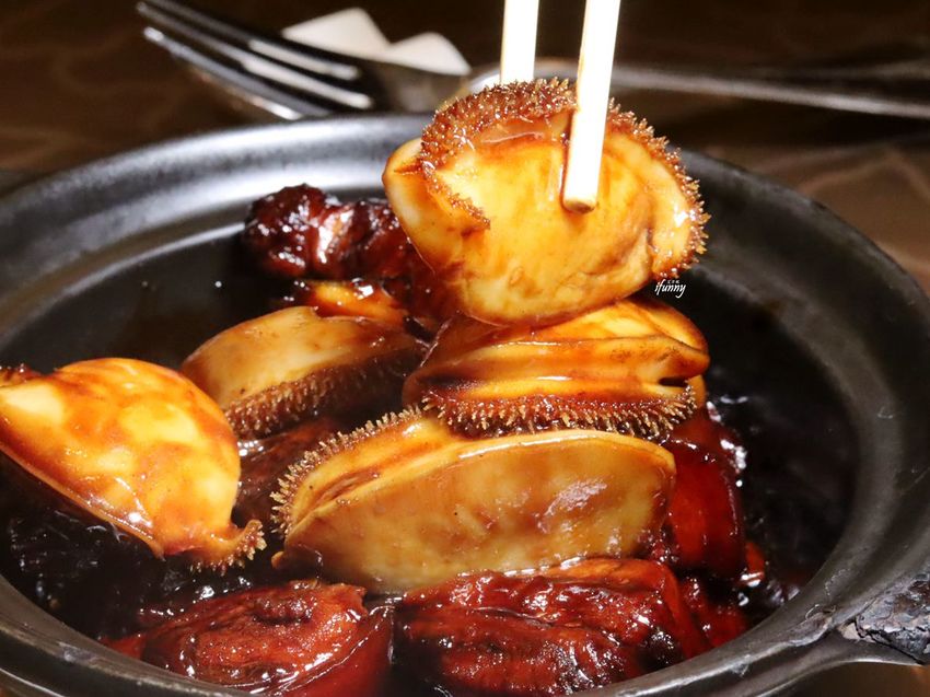 搭配了特選進口南非鮑淋上蠔油燜煮,飽滿的南非鮑嚐來Q彈有嚼勁,看似醬色極重,但入口仍是滿口的鮮甜美味。