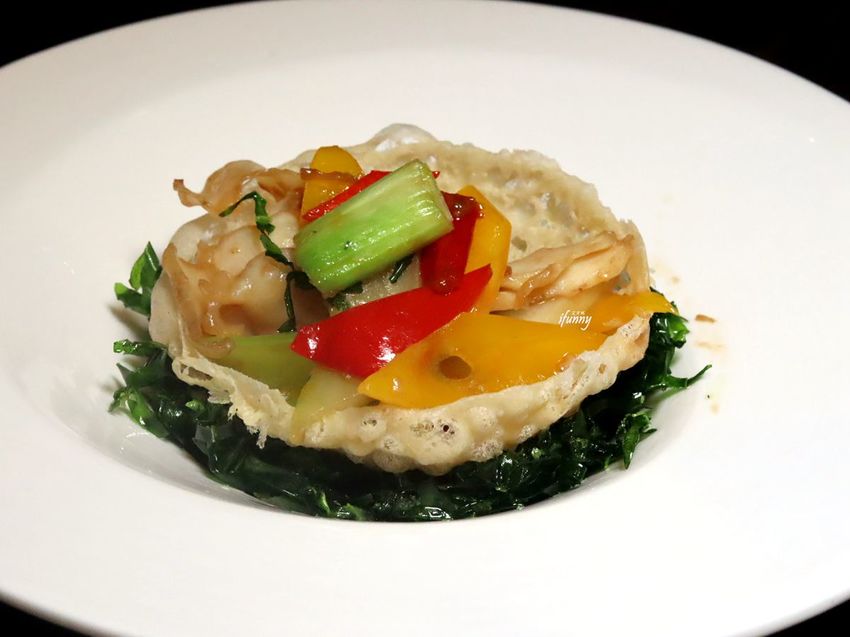 在盤底以酥炸芥蘭菜心襯底,再以餅皮當做器皿,其上盛裝了以五彩蔬菜拌炒龍螺片。