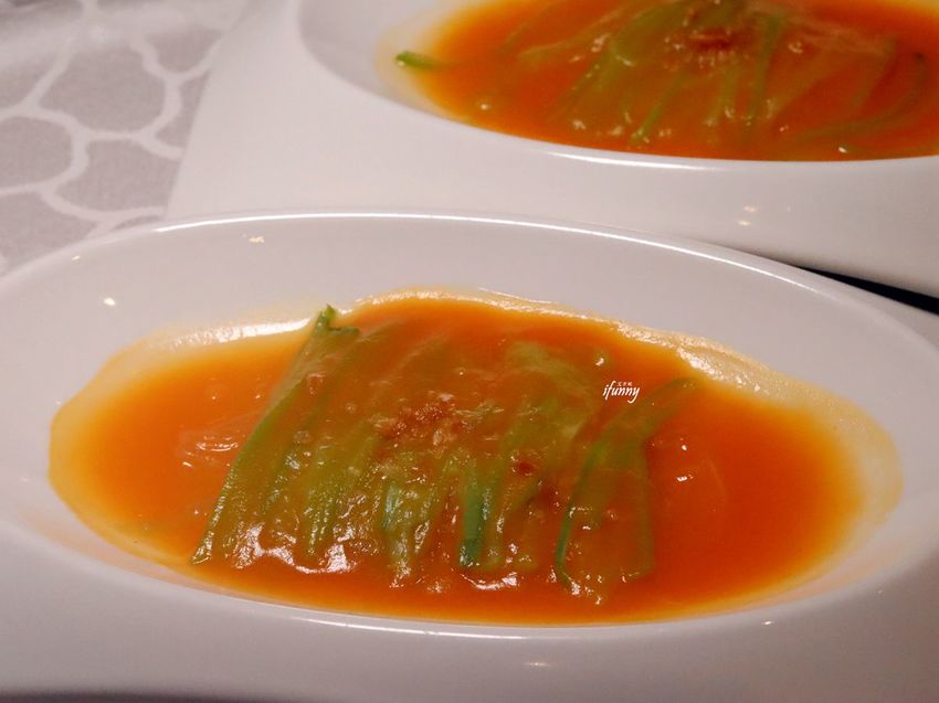 精湛的刀工將絲瓜庖成大小一致的薄絲,精準的火候令絲瓜保有如角瓜一般的脆度。採胡蘿蔔細熬成濃稠醬汁,潤爽的滋味,餘韻悠長。