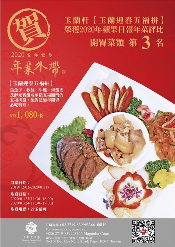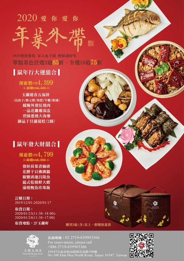 台北王朝大酒店玉蘭軒推出「2020愛您愛您團圓年菜」預購,主打飯店主廚帶領廚藝團隊製作,不假外包工廠量產,保留主廚經典好味道。本次共推出「台式年菜」及「廣式年菜」兩大主軸,適合6到8人享用,每套年菜4,399元起。針對小家庭需求,還有單點選項,任選3道85折、全選10道75折,讓大家過年免下廚,輕鬆過好年。