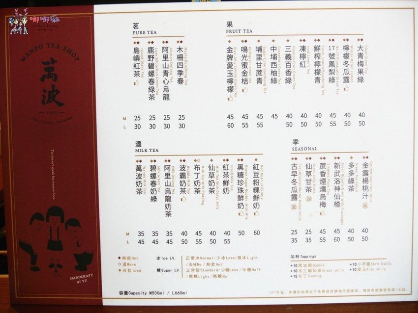 菜單的部分和我們在中壢喝到的沒有差別,自從紫米芋芋椰奶出了之後,好想也沒有再推出新品了。我個人偏好還是紅豆粉粿鮮奶,蠻推薦大家喝的。