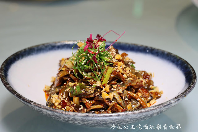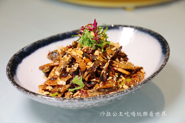 烏骨雞皮吃起來QQ的很有彈性,搭配酥炸過的柳松菇,有著獨特的香氣,口感也很有層次,當作冷盤吃,十分開胃