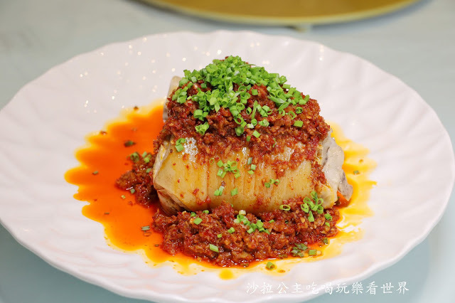 選用大鰱魚頭以酒、薑、鹽搓揉醃製,蓋上雙椒醬後放入蒸鍋約20分鐘,鋪上蔥絲並淋上熱油,加入啤酒提味,將蔥香及雙椒香氣釋放,肉質很細嫩,味道上帶著很鮮明的酸辣鮮甜