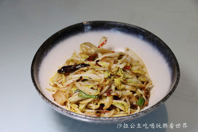 將娃娃菜切絲,與八角、山奈、朝天乾辣椒、蒜片、紅辣椒、五花肉片一起拌炒,再加入麻辣鮮露、蒸魚醬油等調味,吃起來很爽口