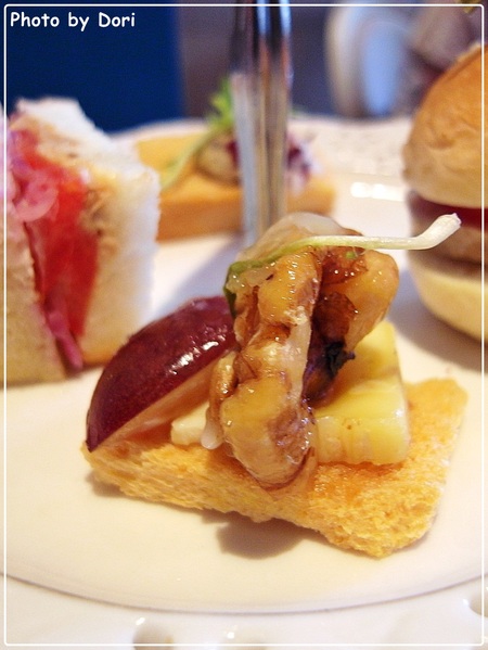 上層為鹹點,鮪魚三明治、小漢堡、核桃起士烤麵包片...等小點心