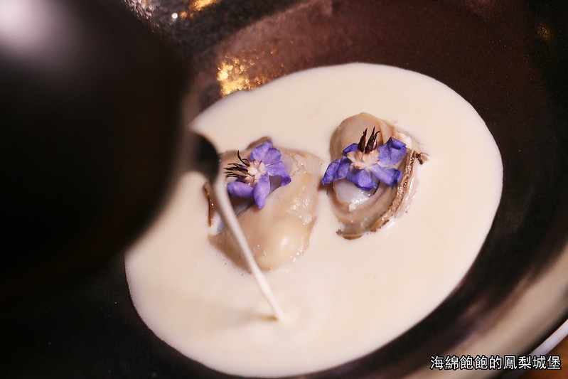 放上食用花卉點綴,倒入生蠔製成的濃湯