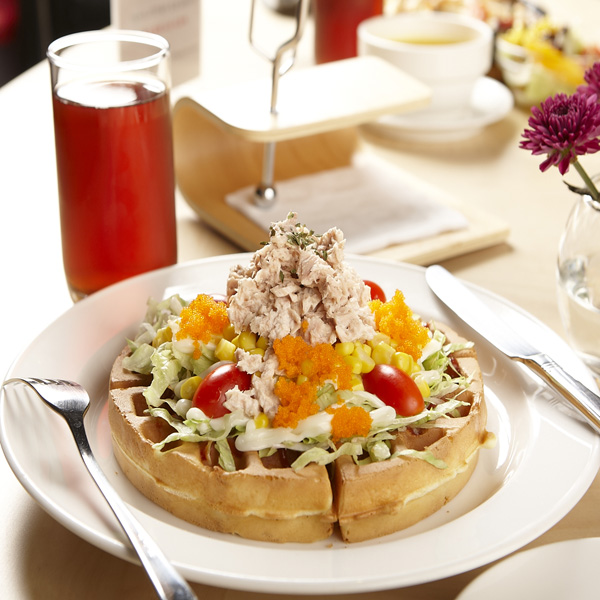 「和風鮪魚沙拉百匯鬆餅」250元/主廚調配的私房鮪魚醬搭配上紅橘鮮豔的蝦卵,加上青翠的生菜,佐些許美乃滋提點口感,多汁的番茄與鮮甜的玉米粒,搭配外皮金黃而內鬆軟的鬆餅,爽口而不鹹膩。平常吃慣了甜口味的鬆餅之外,你也可以嚐試到別有一般風味的鹹口味鬆餅。
