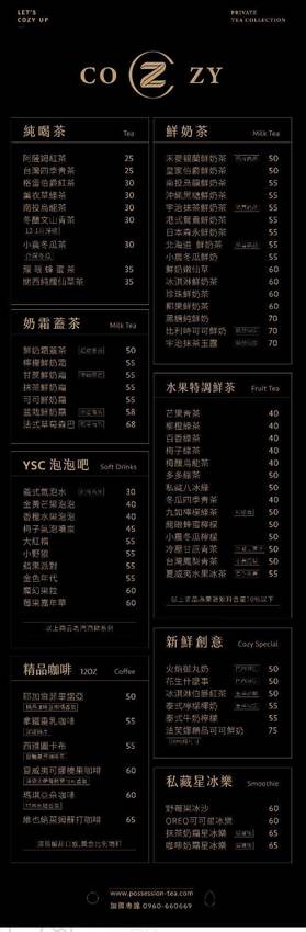 每家《御私藏》的飲品選擇菜單都是相同的,有:「純喝茶/奶霜蓋茶/YSC泡泡吧(氣泡飲)/精品咖啡/鮮奶茶/水果特調鮮茶/私藏星冰樂/新鮮創意茶飲」近七十種選擇….