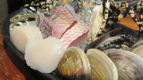 有龍蝦 、日本生食級干貝、台灣野生魚片、海蛤蜊、活鮑魚等豐富海鮮,看到活鮑魚優雅的扭曲柔軟的筋骨,讓我不禁嗔目結舌