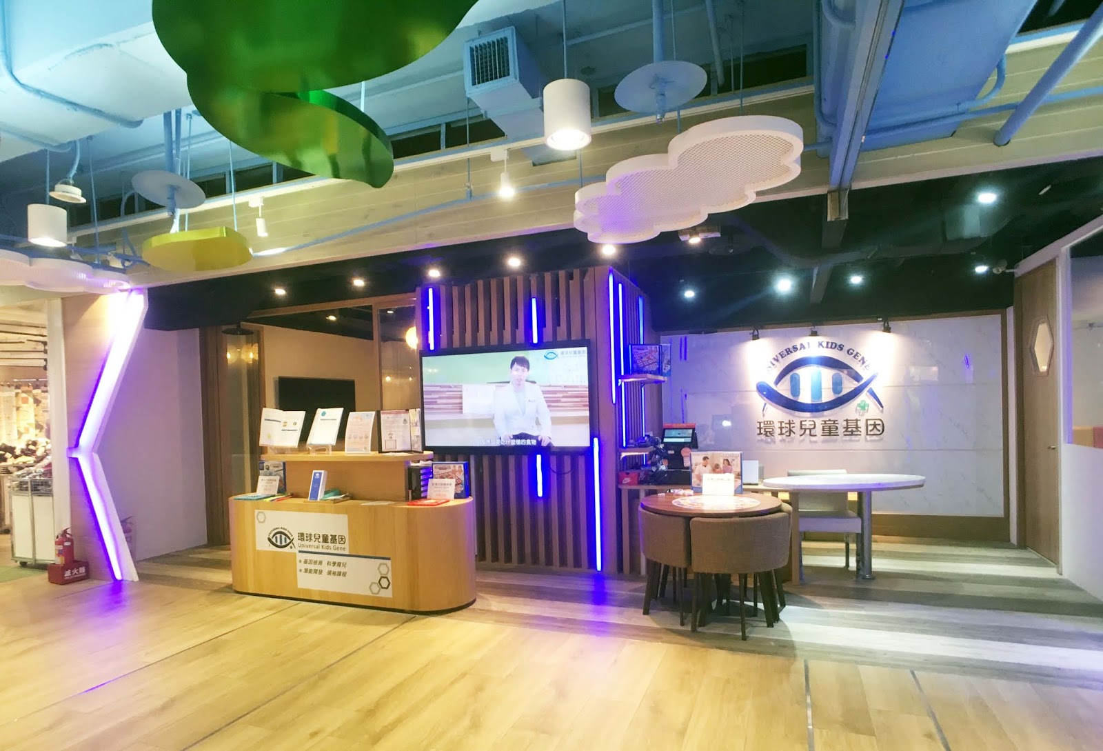 搭電梯來到7樓,「環球兒童發展基因教育中心」櫃位在眾多遊樂園中相當醒目,以藍白色調營造出醫療感與科技感,很符合基因檢測的專業形象。