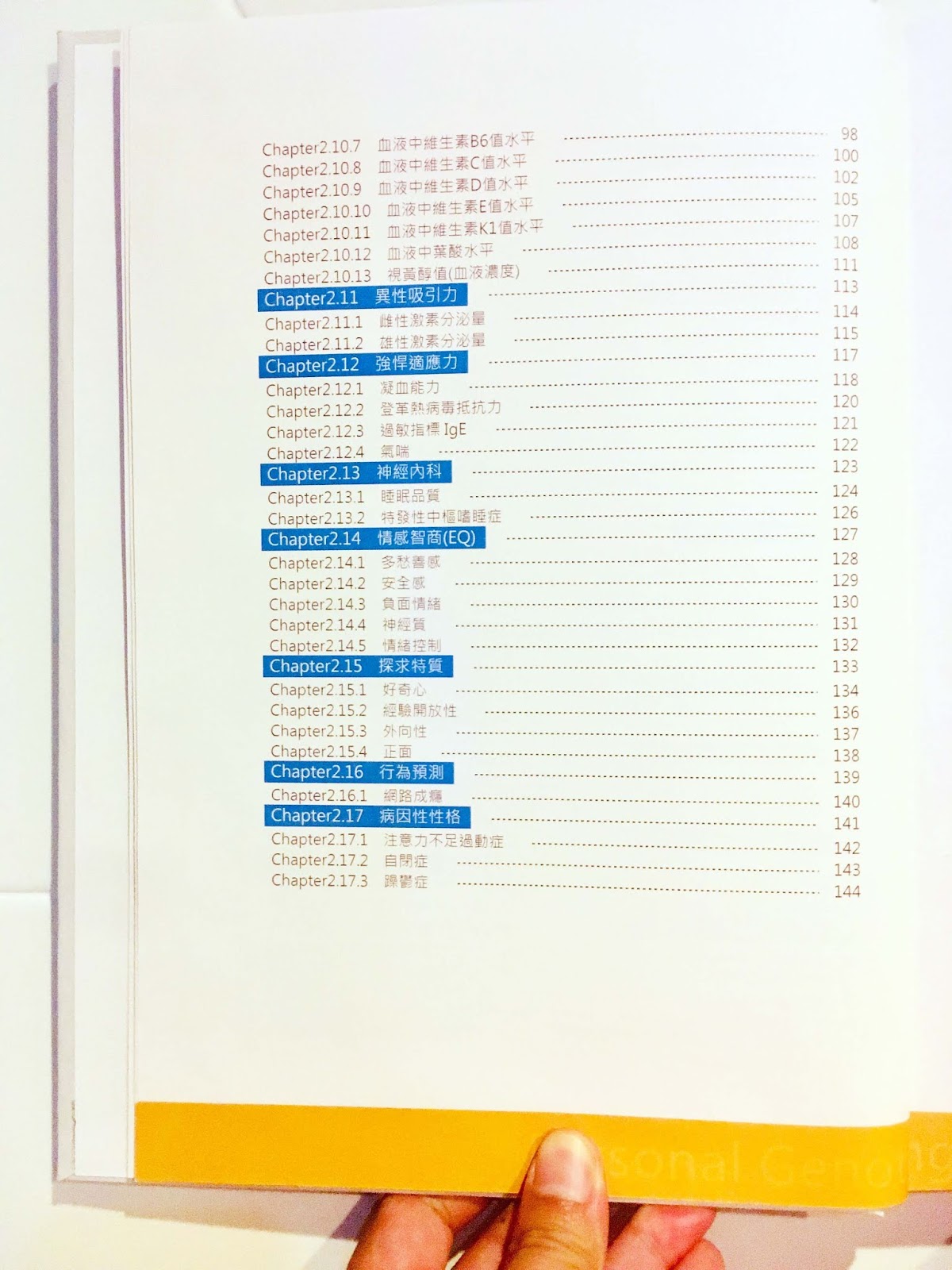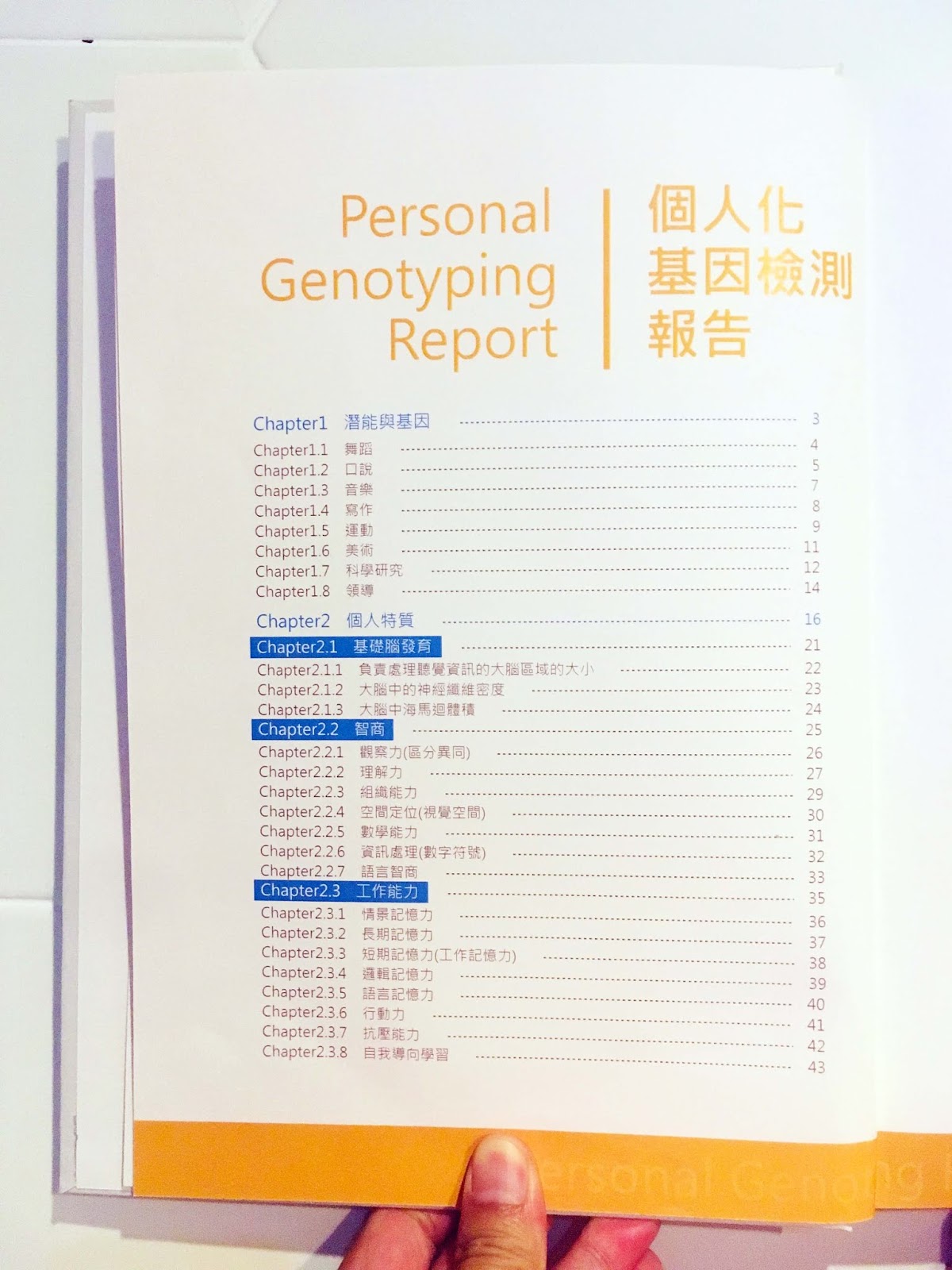 完整的「兒童全方位基因檢測報告」厚厚一本,好像一本百科全書,內容是孩子的個別化基因檢測結果,包括:潛能、基礎腦發育、智商、工作能力、美術天賦、運動天賦、五感、飲食偏好、牙齒健康、身高體重、營養素、異性吸引力、適應力、神經內科、情感智商、探求特質、行為預測、病因性性格...等,都是以孩子的基因序列與當代最新基因資料庫做比對,家長在乎的項目幾乎都包含在內了,是很寶貴的教養參考。