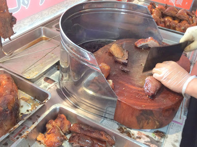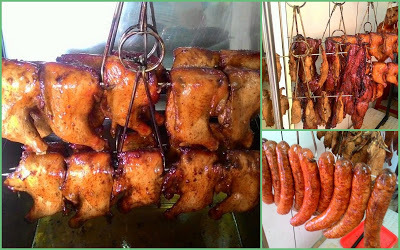 餐檯前掛滿著港式燒臘,雞腿、香腸、燒肉、香噴噴、油亮亮、