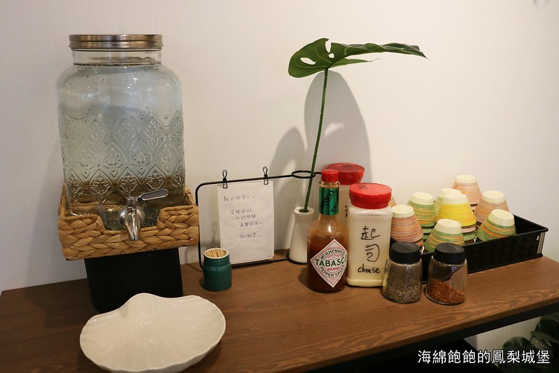 有起司粉、胡椒粉、辣椒粉、TABASCO可自行添加