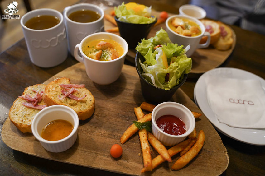 沙拉、冠軍軟法、熬製例湯、羅馬薯條