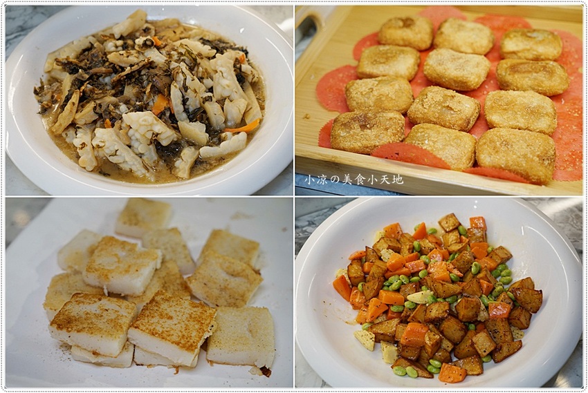 涼拌小菜有台式泡菜、桑葚蓮藕、涼拌黑木耳、黃金泡菜、百香南瓜、涼拌綠晶藻等等