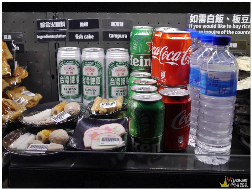 ▲綜合火鍋料、魚板、甜不辣!另有礦泉水、可樂、海尼根和台灣啤酒(喝酒不開車,開車不喝酒)。