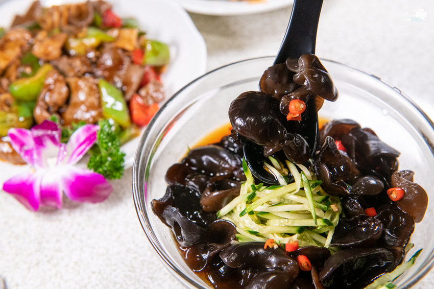 選用來自東北長白山的野生木耳,因為老闆娘本身是東北遼寧人,所以時常往來台灣與對岸東北,將這知名的食材帶回台灣的,目前正是東北木耳的盛產季,所以也稱小秋耳。與一般常見台灣或者是四川的木耳不同,長白山的野生木耳比較大片、比較厚也比較彈脆,質地黑亮細膩光滑,爽滑脆口滋味佳,讓凌雲對長白山木耳留下很好吃的深刻印象,友人之一超愛這道菜。