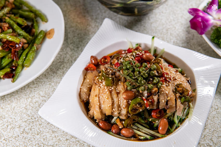 上方鋪著來自四川的青藤椒,辛香味芬芳,麻味較為柔和清新,不那麼刺激。口水雞的花椒麻油來自四川雅安,四川雅安漢源花椒歷史相當悠久,在唐朝時期列為貢品,所以也稱為「貢椒」,氣味辛和芳香濃郁,醇麻爽口與鮮嫩的雞肉滋味非常合拍。