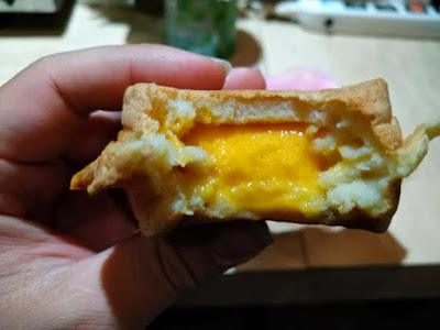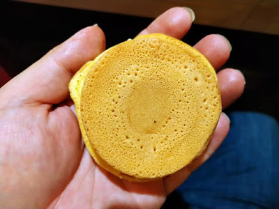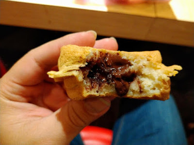 很快地就弄好了,店裡的稚齡小弟弟負責收錢送餐,很可愛。我外帶到了咖啡館後才慢慢品嘗;第一個吃的是起司口味,濃郁鹹鹹的起司跟餅皮很搭,是個不錯的組合。接著吃的是巧克力,巧克力令人意外,因為才一小口就爆漿了,稱之為超強爆漿巧克力也不為過,因為邊吃邊爆漿,而且越爆越嚴重,流滿餅皮和手指,是個驚奇的食物,甜度也拿捏得不錯,是個好吃的口味。至於奶油吃起來就有點普通,不知道是否是因為剛剛吃的都是重口味的關係,總覺得內餡不太綿密,有點尋常。紅豆口味也有類似感覺,不難吃,但也沒有太明顯的特色。