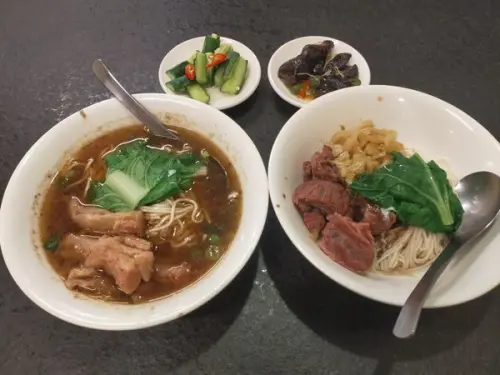 看了一下菜單,菜單上有湯麵,乾麵及湯類~三款牛肉麵150元,其餘麵價格35~60元不等,我點了碗榨醬乾麵40元,餛飩湯30元,另外在外頭的小菜區選了一個花干及半份素的什麼(一時想不起來叫啥名),沒留意小菜價錢,但總計收了105元,所以小菜部份是35元.