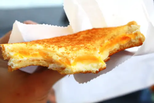 來這裡就是要點一份炭烤吐司,可以像我一樣加起司只要再多加10元,將肉片和起司夾入炭烤過的吐司裡,起司包覆著肉片,一口咬下真的超享受,加套餐再加49元,就可以脆薯或雞塊二選一,還有25元以下的飲品任選