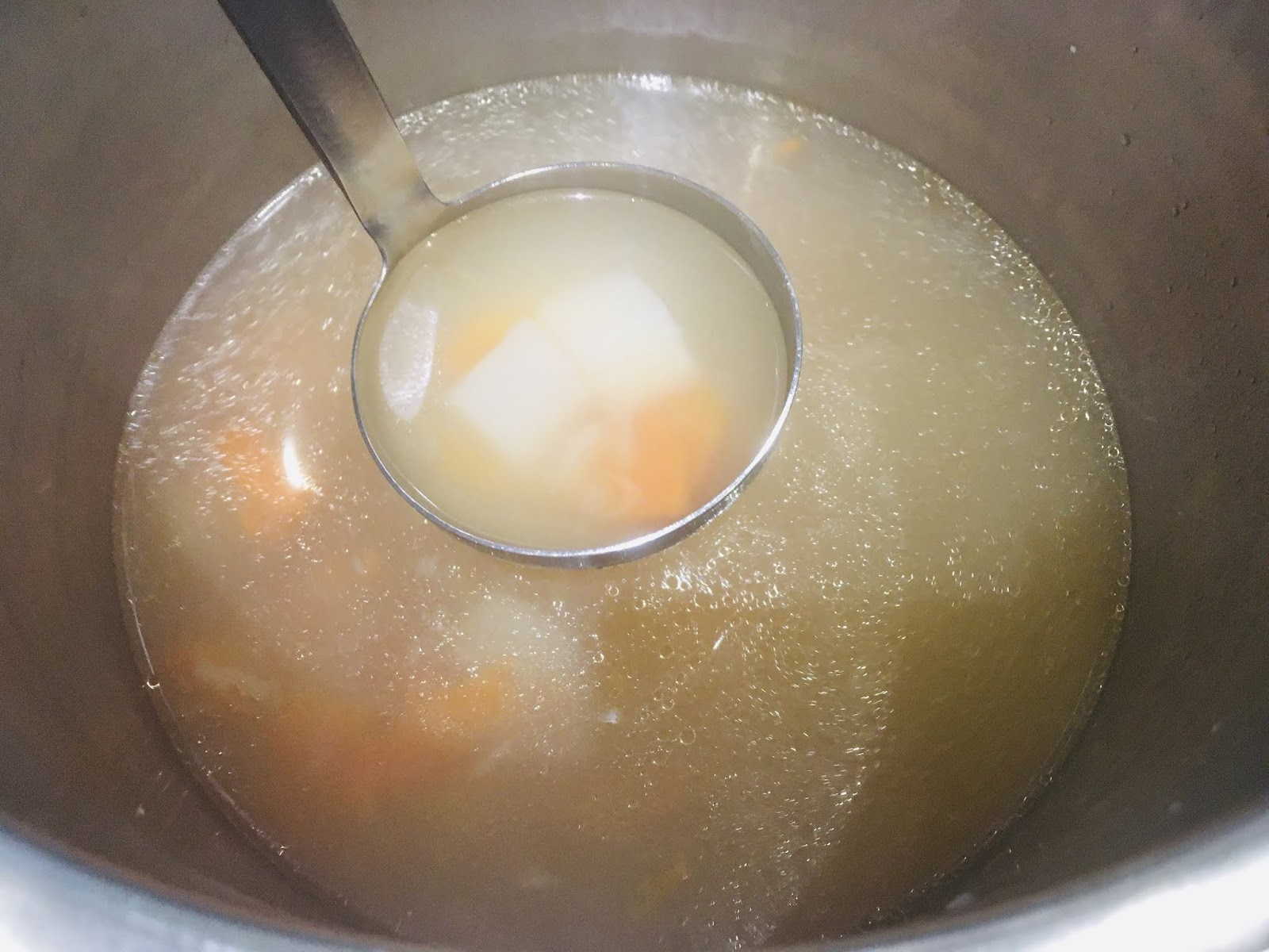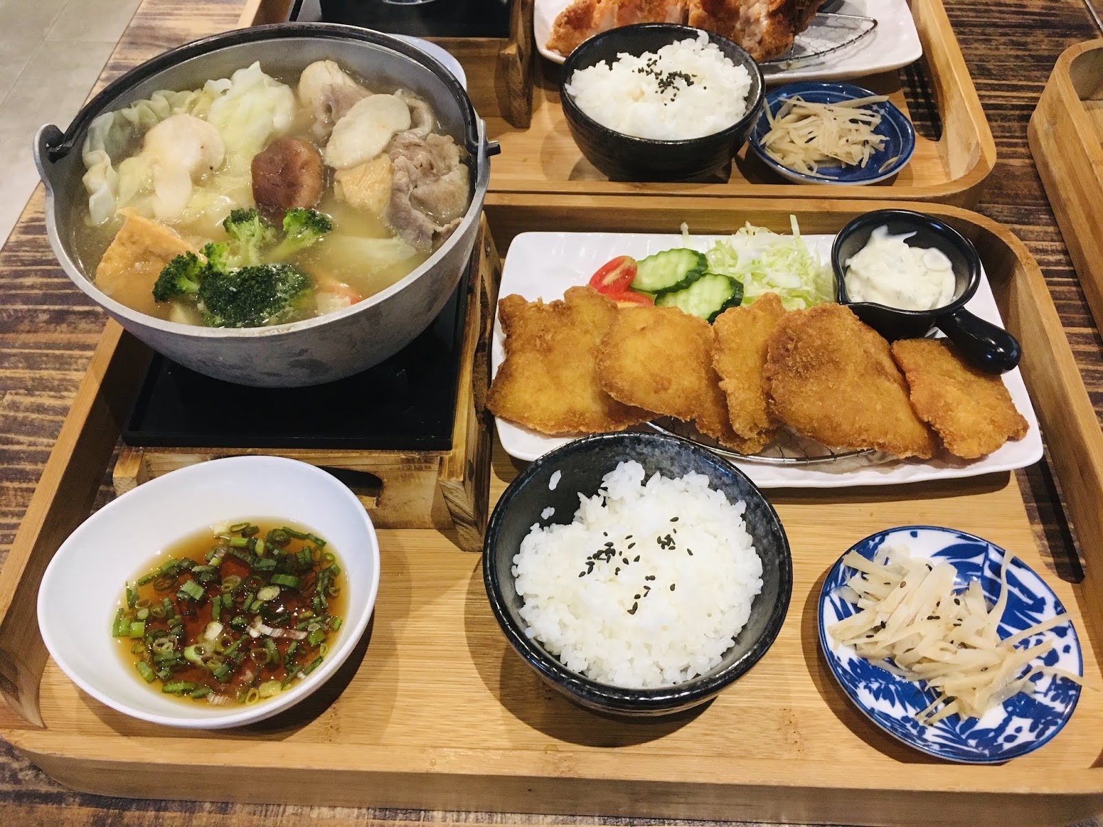 「開運昆布鍋(金黃魚排)」的昆布鍋裡有豬肉、多種青菜及菇類,湯頭有昆布的自然甜味,口感清爽甘甜,加上金黃酥脆的魚排和涼爽酸脆的牛蒡絲,讓人吃得很滿足。