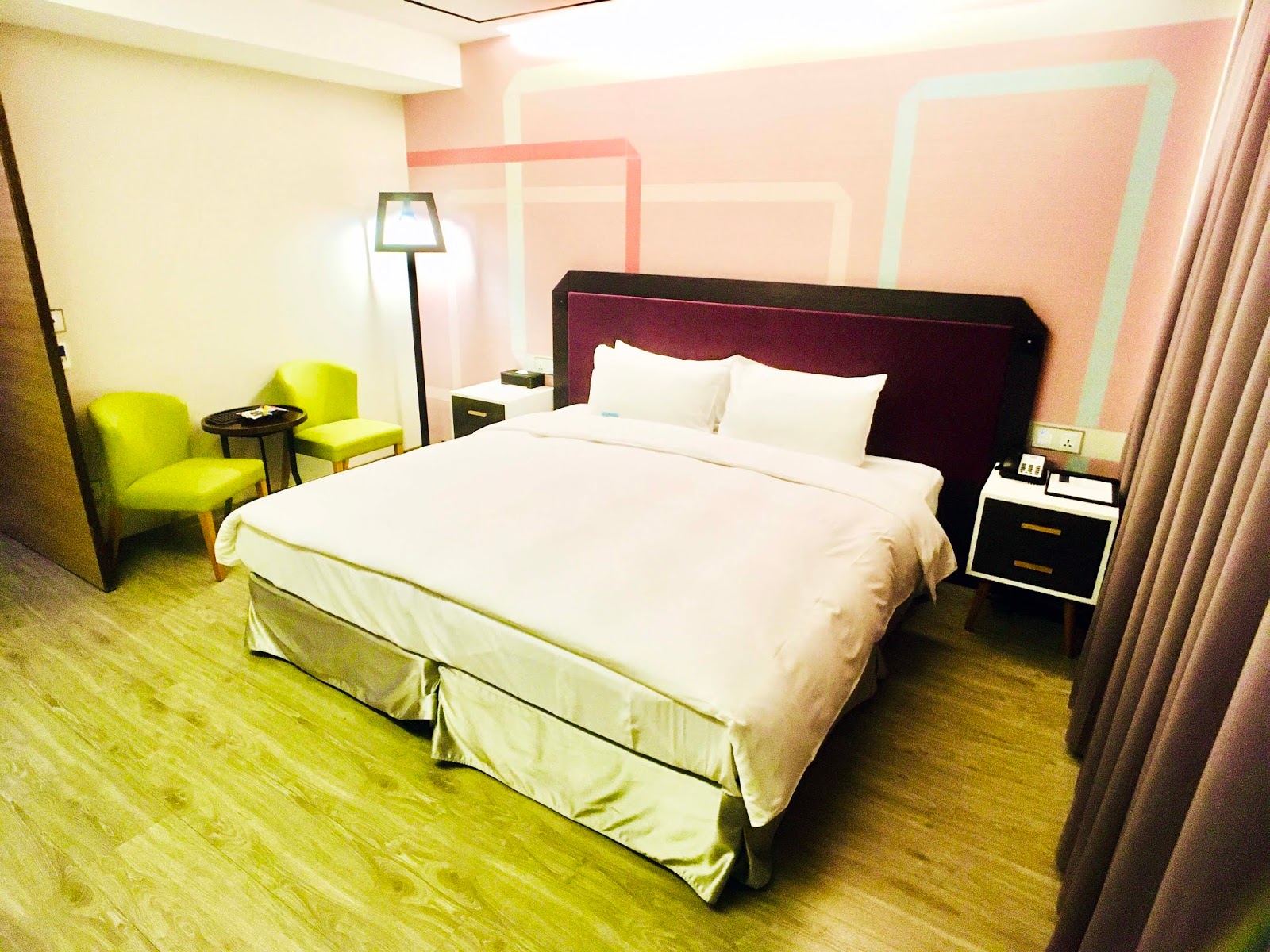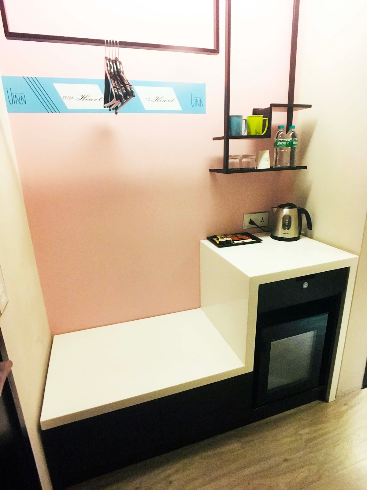 我們入住的房型是「雙人悠逸房」,進門之後,會看到一個粉色系的夢幻空間,玄關採輕工業風裝潢,左手邊是衣架、冰箱和熱水壺,櫃上有咖啡、茶包和礦泉水,簡單實用。