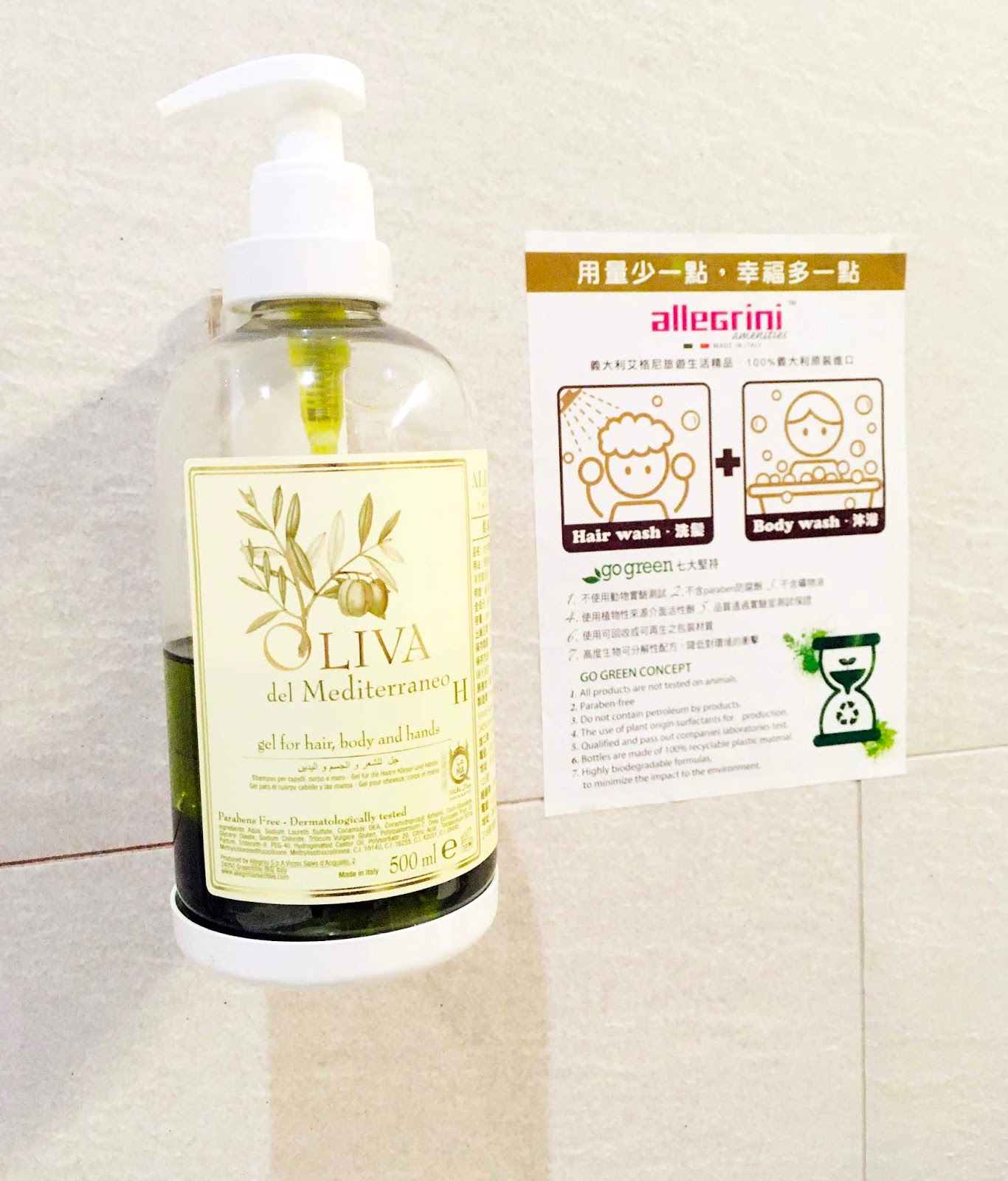 牆上有二合一的OLIVA有機洗髮沐浴露,使用時只要一點點的用量就可以洗得很乾淨,對人和環境都友善。