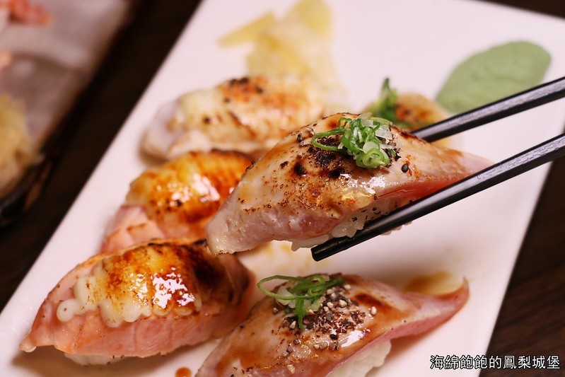有鮭魚、鮪魚、旗魚、花枝,都有炙燒處理