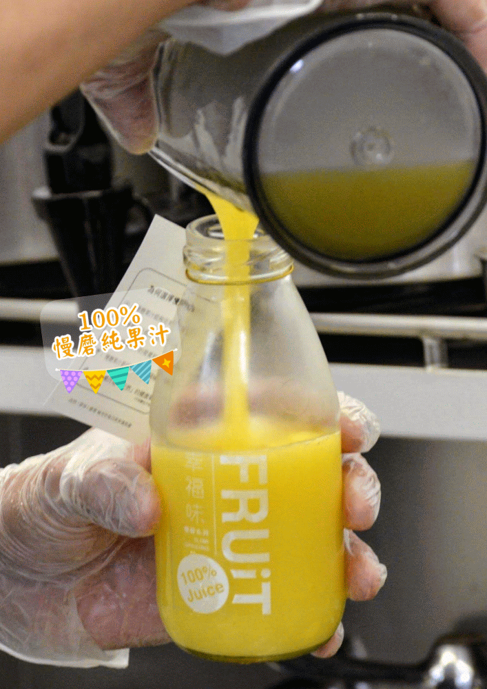 慢磨果汁是使用慢速低溫的壓榨原理現榨果汁,能夠完美保留酵素和水果原味與香氣,且讓身體順利吸收,適合老人、兒童、孕婦...。在現場點單後,會看到工作人員採用新鮮水果現洗現切現榨到直接裝入玻璃果汁瓶,為了就是讓客人喝到最營養天然的100%健康純果汁。當日我們選用兩種口味:鳳梨+蘋果/芭樂+蘋果,各由兩樣水果現榨成汁,選單的前者水果名稱佔較多比例,依照當季水果滋味決定口感,一瓶果汁,就看到份量相當多的鳳梨、芭樂與蘋果,非常適合平日外食族與平日少食蔬果的人喔。