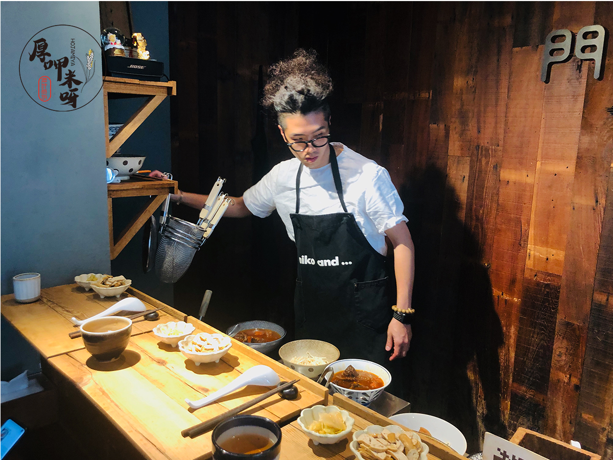 到店家時正好碰上前一組客人用餐完畢開心拍照中,滿懷期待進到店中,只有小小的座位空間,彷彿進入日本特色拉麵店中,店家一個時段服務5個客人,在這個時段中,大叔專心的製作5人份的料理,專注的眼神中帶有一種堅持的熱情,所謂的職人也正是帶著這樣的魅力。