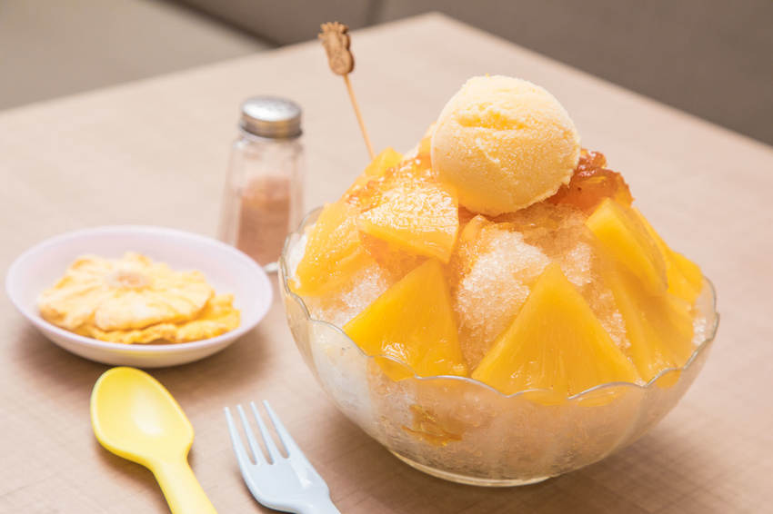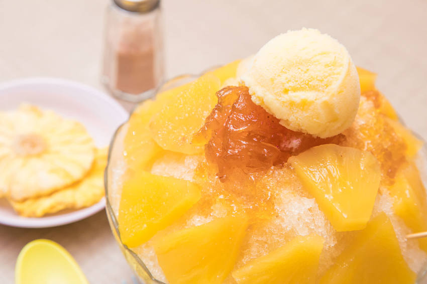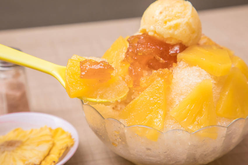 有沒有注意到鳳梨有什麼不一樣,比起一般鳳梨顏色要鮮豔許多,鳳梨片有先用糖煮過,不僅可以提升鳳梨的甜度,也可以避免生鳳梨的刮口感,但煮的時間跟糖的比例都要經過嚴格的計算,除了鳳梨片外,裡面還加了蜜鳳梨,蜜鳳梨要經過長時間的熬煮,蜜鳳梨口感濃稠綿密,鳳梨香氣及果酸甜味完全濃縮,伴著冰一起入口剛剛好